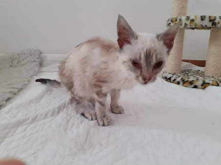'Het was een arm hoopje van snot en pus,' vertelt Vera triest. Zonder twijfel brachten ze het dier naar de dierenarts, waar ze ingesprayed werd tegen de vlooien en ze medicatie voorgeschreven kreeg. Sindsdien gaat deze poes als 'Tooty' door het leven.